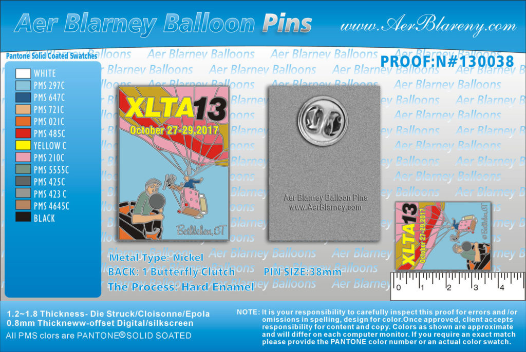 Aer Blarney Balloon Pins, LLC provides custom pins, patches and stickers for hot air balloonists, special events, organizations, and companies. Our custom hard enamel pins can be produced and shipped in as little as 10-12 days. We take your design or we can create a design for you and provide artwork proof in 24 hours or less.